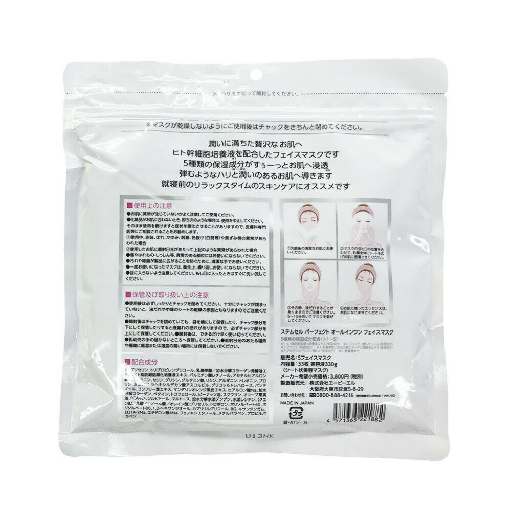 ヒト幹細胞培養液配合 ステムセル パーフェクトオールインワンフェイスマスク33枚入 ハリ 小じわ エイジングケア デイリーマスク
