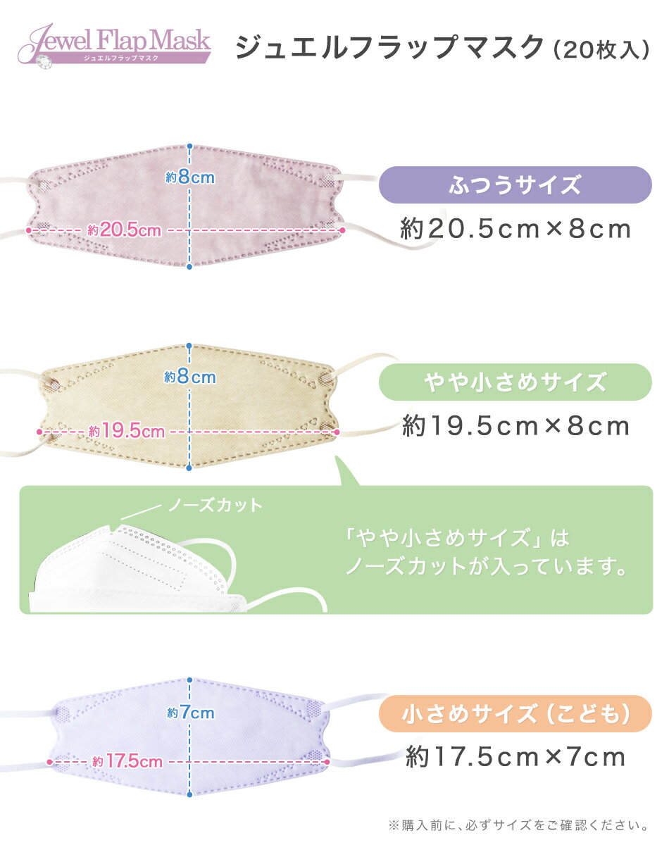 ノーズワイヤーが鼻周りをしっかりと固定するので、空気の漏れが少なく、メガネが曇りにくい! 肌の摩擦を軽減するので、メイク崩れが気になる女性にもオススメです! 【各メディアで当店のプリーツマスク(血色マスク)が紹介されました!】 <雑誌> ・文藝春秋「週刊文春WOMAN」・文友舎「JELLY」・小学館「CanCam」 <テレビ> ・ひるおび!(TBS)・ZIP!(日本テレビ)・news every.(日本テレビ)・Nスタ(TBS) ・モーニングショー(テレビ朝日)・めざましテレビ(フジテレビ)他多数 商 品 詳 細 内容 ・ジュエルフラップマスク(4層構造・立体不織布マスク) 20枚入 ×1箱 *5枚ずつ個包装 ・ジュエルフラップマスク(3Dデイリースタイル) 20枚入 ×1箱 *5枚ずつ個包装 ・冷感プリーツマスク(3層構造・不織布マスク) 20枚入 ×1箱 *10枚ずつ個包装 バリエーション ≪アソートセットA≫ ライラックアッシュ、ローズ、ピーチメルバ、ハニー × 各5枚 ≪アソートセットD≫ ライラックアッシュ、ハニー、ピンクベージュ、ライトオークル × 各5枚 ≪元祖・血色カラーシリーズ≫ ・ハニー ・ローズ ・ライラックアッシュ ・ピーチメルバ ・ベリーチューリップ ・モカブラウン ・コーラルオペラ ・ミルクティースモア ・ピンククォーツ ・ピンクベージュ ・ライトオークル ≪シャーベットカラーシリーズ≫ ・ペールラベンダー ・シュガーピンク ・ミスティサボン ・アイシーミモザ ・ミントミキサー ≪カジュアルカラーシリーズ≫ ・アイスグレー ・ライトオリーブ ・フェザーマリン ・デニムヘイズ ≪メロウカラーシリーズ≫ ・レイニースモーク ・ブラック ・ダークグレー ・カーキ ・ネイビー サイズ ・ジュエルフラップマスク (約)幅205×高さ80mm(普通サイズ) (約)幅195×高さ80mm(やや小さめサイズ) (約)幅175×高さ70mm(子供向けサイズ) ・ジュエルフラップマスク(3Dデイリースタイル) (約)幅114×高さ135mm(Mサイズ) ・冷感プリーツマスク (約)幅175×高さ95mm(普通サイズ) 材質 不織布、ポリエステル 特徴 【特注仕様】両面同色・耳紐同色 選べるバリエーション 3D立体デザイン 99%カット高密度フィルター 4層構造(立体マスク) 3層構造(3Dデイリースタイル、プリーツマスク) 5枚ずつ袋入り(立体マスク、3Dデイリースタイル) 10枚ずつ袋入り(プリーツマスク) 小顔効果 平ゴム採用 耳が痛くなりにくい 風邪予防 飛沫対策 花粉対策 PM2.5対策 ウイルス飛沫対策 ハウスダスト対策 保証期間 7日間 ※商品到着後7日以内の初期不良・破損のみご対応させていただきます。