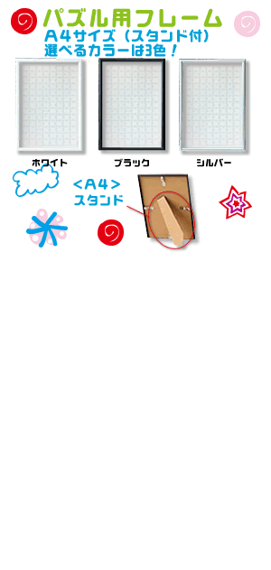 アイデア次第で、素敵なオリジナルパズルの出来上がり! フレームのカラーは・ブラック・シルバーの2色から選べます! 【サイズ】 A4サイズ 外寸 297mm(W)×209mm(H) パズル部分 268mm(W)×180mm(H) フレーム 210mm(W)×297mm(H) ※外寸はパズル部分と外枠を含めたサイズになります。