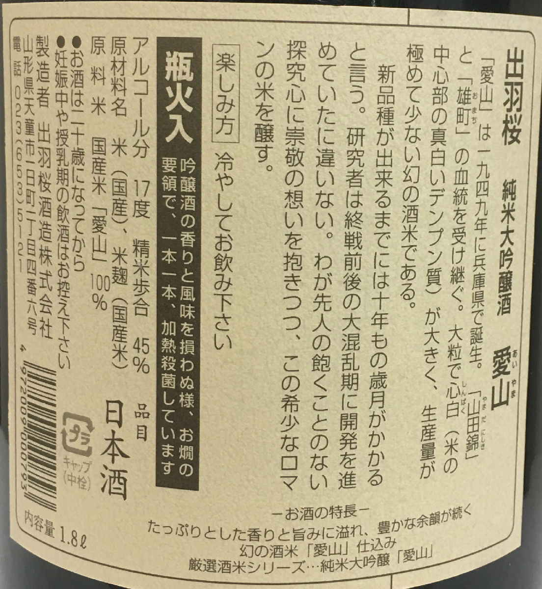 素晴らしい香り、味わいで、 贈り物にも最適! 原材料名:米(国産)、米麹(国産米)、 醸造アルコール 精米歩合:45% アルコール度:15度 製造年月:2022年1月以降 ・出羽桜 純米大吟醸酒 愛山 1800ml 瓶火入 兵庫県産『愛山』を使用した限定商品です! 出羽桜酒造らしいフルーティーな香りと、 優しい味わいの深いお酒となっています。