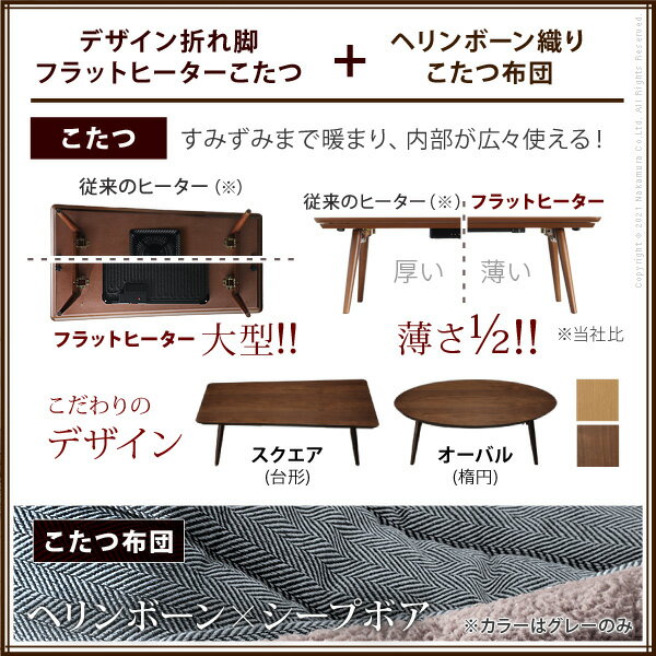 【セット構成】 こたつ本体 1台 こたつ布団 1枚 【こたつバリエーション】 オーバル・スクエア 【カラーバリエーション】 ■こたつ本体 オーク(ナチュラル)・ウォールナット(ブラウン) ■こたつ布団 グレー 【仕様】 ■こたつ本体 天板:天然木化粧繊維板 脚部:天然木(ラバーウッド) フラットヒーター(130W・中間スイッチ式) コード長さ:約2.8m ◎完成品 ■こたつ布団 表地:ポリエステル53%・綿39%・レーヨン8% 裏地:ポリエステル100%(シープボア) 中綿:ポリエステル100% 【サイズ】 ■こたつ本体 [オーバル] 幅115x奥行60x高さ38cm 重量:約18kg 天板サイズ:幅115x奥行60cm・厚み25mm・7.7kg 脚間:85.5/44cm [スクエア] 幅120x奥行60x高さ38cm 重量:約20kg 天板サイズ:幅120x奥行60/50cm・厚み25mm・8.2kg 脚間:98.5/44cm ■こたつ布団 230x190cm 重量:中綿約740g 株式会社ナカムラ(I-5701300)>こたつ単品 >こたつ+ヘリンボーン織りこたつ布団セット