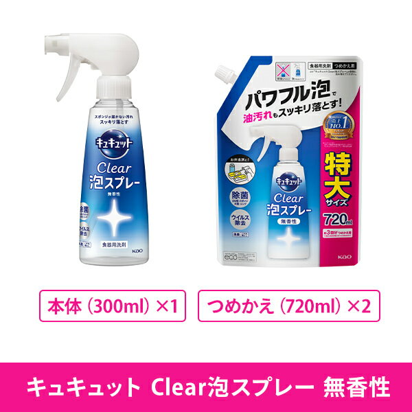 キュキュット クリア泡スプレー 食器用洗剤 無香性本体 300ml×1本 つめかえ 720ml×2個 CLEAR 泡スプレー 台所用 合成洗剤 洗剤 キッチン用洗剤 詰め替え 詰替え 水筒 ストロー タンブラー 業務用 まとめ買い 纏め買い 花王 Kao 【送料無料】