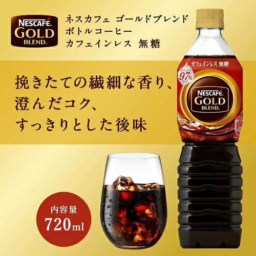 【商品説明】ネスカフェ ゴールドブレンド カフェインレス 無糖 ボトルコーヒー 720ml ●厳選アロマキープ製法を導入し、香りを多く含む成分をより厳しい基準で管理して、酸化の原因となる空気との接触をメーカー従来品よりもさらに低減することで、上質な香りを素早く封じ込めています。